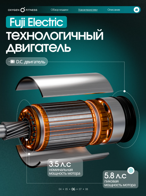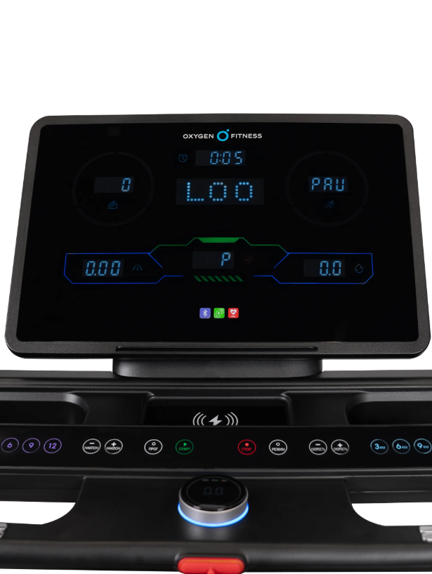 OXYGEN FITNESS COPPER — мощная электрическая беговая дорожка премиального уровня для полукоммерческого использование с интенсивной нагрузкой. Модель ориентирована на пользователей, которым важны высокая скорость, широкий беговой простор, продвинутая амортизация и современные технологии комфорта. COPPER подходит как для регулярных пробежек, так и для серьёзных тренировок с электронным наклоном и контролем показателей, обеспечивая ощущение клубного уровня у себя дома. В основе дорожки — массивная высокопрочная рама с антикоррозийной обработкой и двухслойной покраской, рассчитанная на долгий срок службы. Корпус выполнен из ударопрочного полистирола HIPS, устойчивого к механическим нагрузкам. Беговое полотно размером 140 ×52 сми толщиной1,6 ммсоздаёт просторную и безопасную зону для естественного шага и быстрого бега. Парафинированная дека из МДФ толщиной12 ммобеспечивает стабильность и плавность хода. За снижение ударной нагрузки отвечает профессиональная система амортизации на базе 8 динамических эластомеров VCS™, эффективно защищающая суставы и позвоночник даже при высокой интенсивности тренировок. Электронная регулировка угла наклона с 15 уровнями позволяет точно управлять нагрузкой и имитировать бег в гору. OXYGEN FITNESS COPPER оснащена мощным двигателем3.5 л.с. DC Fuji Electric с пиковой мощностью5.8 л.с., обеспечивающим стабильную работу в диапазоне скоростей от 1 до22 км/ч— от разминки до скоростного бега. Консоль и управление: • LED-дисплей с белой индикацией, • отображение: время, скорость, дистанция, калории, пульс, программа, жироанализатор, • сенсорные датчики пульса на поручнях. Программный пакет включает 30 тренировочных режимов: • ручной режим, • 24 предустановленные программы, • 3 пользовательские программы, • 1 пульсозависимую программу, • жироанализатор. Дополнительные возможности: • Bluetooth-колонки для воспроизведения музыки, • Bluetooth для подключения к приложению Fitshow™, • возможность подключения Bluetooth-кардиодатчика, • беспроводная зарядка смартфона, • подставка под планшет или смартфон, • отсеки для аксессуаров.
